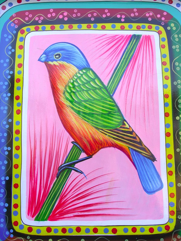 …having seen a bbc report on pakistani truck art, i immediately jumped on the web to find more eye candy! these images are a potent use of color and an absolutely dazzling array of exotic animals, women, florals and geometric motifs embellished with chiming bells, coins and twinkling mirrors. i am in love! it’s like a psychedelic gingerbread house on wheels! i would dream of a small room covered ceiling to floor with these beautiful paintings, layered with velvet tasseled cushions and scented with my favorite dhanraj maharaja incense. the room would open onto a small courtyard lush with vegetation and alive with the warble and chirping of budgies. (courtesy of my own flock chirping in the background!) to see them taking it to the streets was unexpected and inspiring!