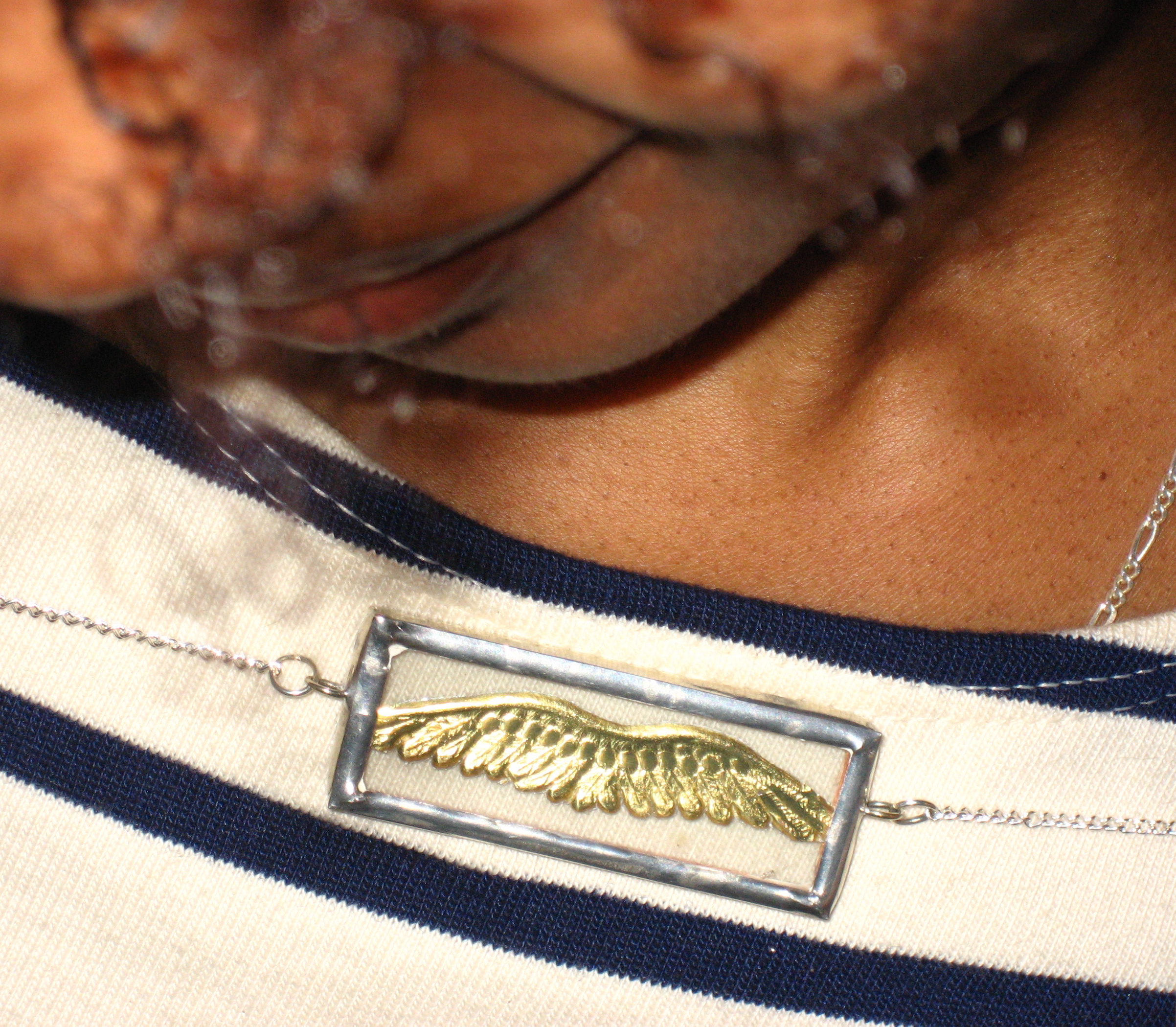 …is golden and a bit of gold was one of my gifts this christmas! my partner bestowed upon me, a golden wing encased in glass, copper and silver. an unusual piece fashioned by a vancouver artist who goes by the name of “type b.” the artist is a self confessed collector of small things and delights in juxtaposing vintage elements into quirky one of a kind objets d’art. i couldn’t wait to pair it with an outfit: