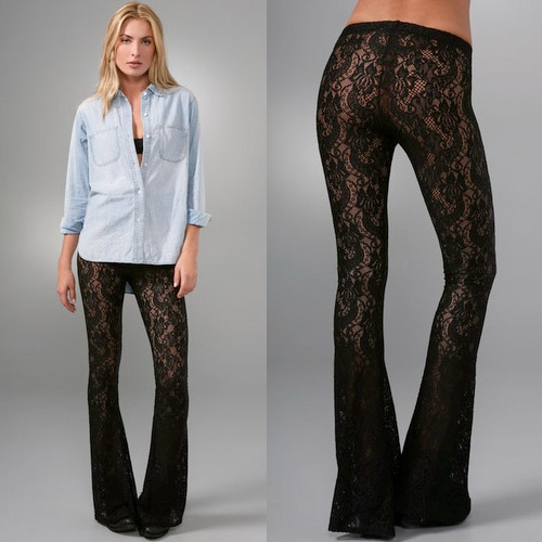 …can add yet another season of revival. having lived first through the decade and then at least two revitalized periods of this trend, once again we see designers like michael kors, marc jacobs and rebecca taylor trotting the high waisted flare down the runway for another go round. i, for one, am sick of reliving the same decades over and over again. i can understand that basic cuts will resurface time and again but can we at least see changes in fabrication or print even? everyone talks about the “modern” take on flares but frankly i have yet to see it. the only chances i’ve seen taken were by georgie, kova & t and nightcap who did them in lace (thank you nightcap for actually adding a shorts liner to the above left thus sparing us the sight of yet another attention starved starlet going commando).