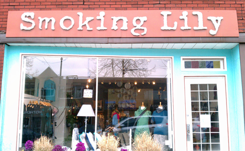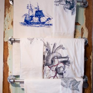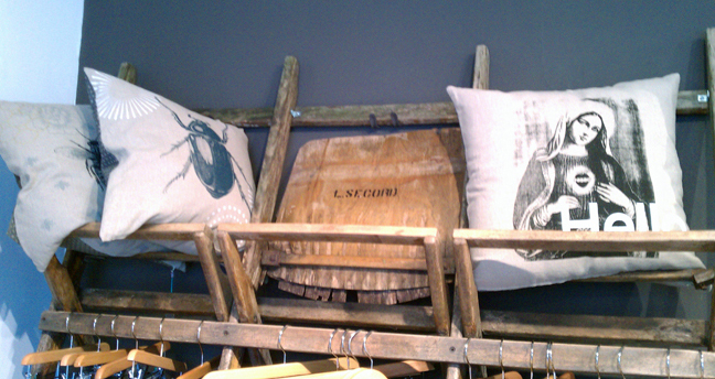 …is a rare find in vancouver and hopefully an indication of more to come. my first round here in the green capital left me at a loss for shops that stock local designers and artists. several smart looking boutiques only seemed to carry the very designers that i see regularly stateside making my search for a breath of fresh air difficult. what struck me first, was the overall effect of the shop. smoking lily takes vintage style engravers illustrations and works them into homeware, accessories and apparel while the essence of that theme is carried out beautifully throughout the space. nothing is left to chance from the time stopping window displays, the clever hanging artscapes or the rustic touches of reclaimed wood and vintage sample cases.
