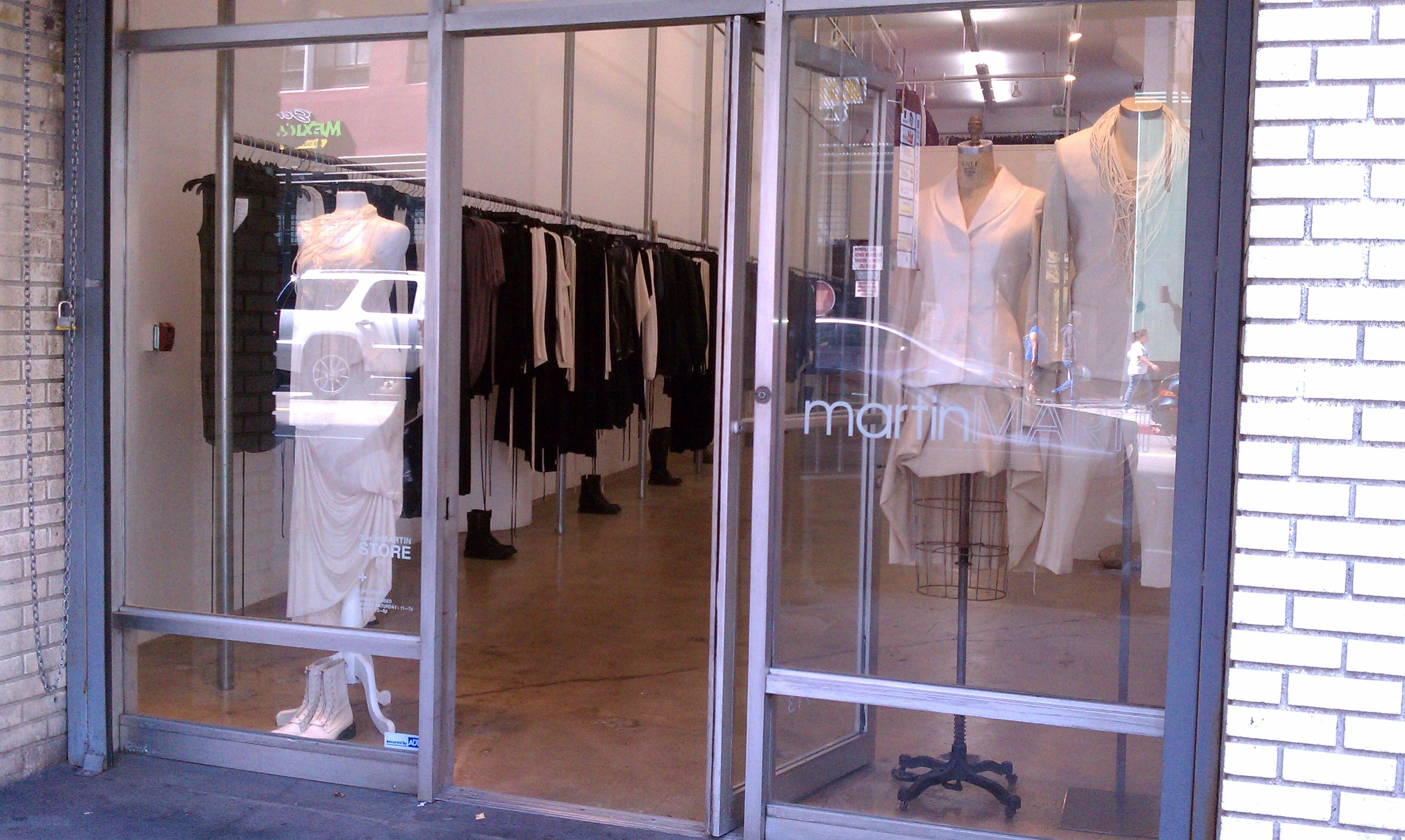 not only was i able to score that amazing frame on los angeles street, i also came across the new home of martinMARTIN clothiers. quiet and lux, these items are impeccably well made with beautiful attention to detail and fabrication. waxed woven coats and delicately gathered dresses make up some of the pieces in the avant garde collection. gorgeous leather boots are hand crafted with italian leathers and nothing is done without imagination and skillful editing. boasting apparel for women and men, the space itself is bright, clean and airy lending itself perfectly to showcasing the stock.