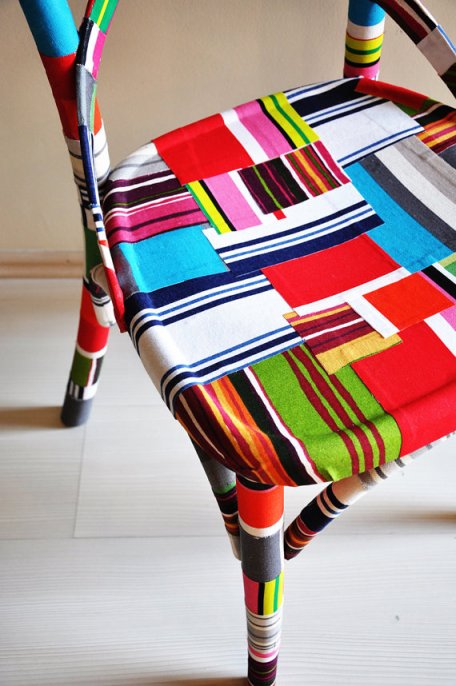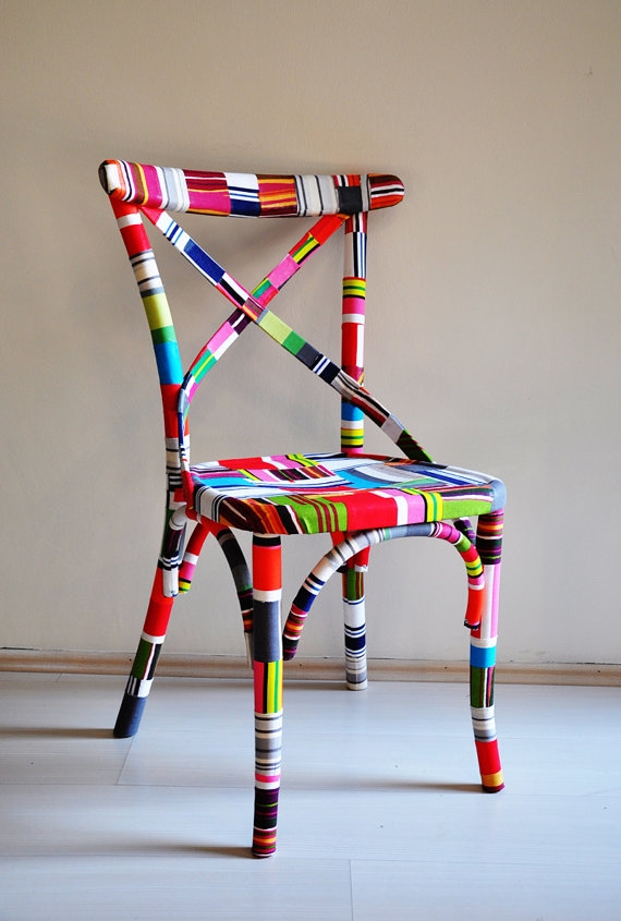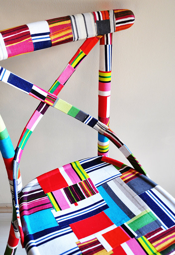 i have to say i love, love, love the chic ethnic look of these colorful fabric adorned chairs i found on etsy! unfortunately the price tag makes them far too dear and the cost of shipping makes them a complete pipe dream. still, i felt the urge to promote their fabulousness here on the hype. just in case some of you thousandnaire’s have extra cash laying around. for the rest of us who are handy with fabric and mod podge, these chairs are at best, an inspiring diy project!