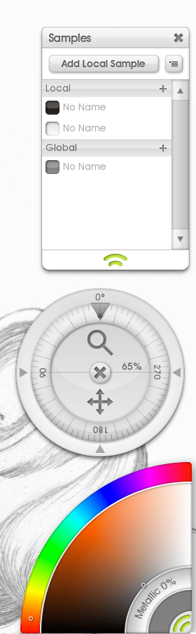 even the navigation tool is genius allowing me to rotate and zoom the canvas easily by using this handy flywheel. its little touches like this that give me the warm and fuzzies mimicking real time freehand drawing. this is especially useful when i’m layering in pencil strokes and need to rotate the image to facilitate a natural curve. the color picker is conveniently tucked in the corner of the art board and adding color samples is just a simple click.