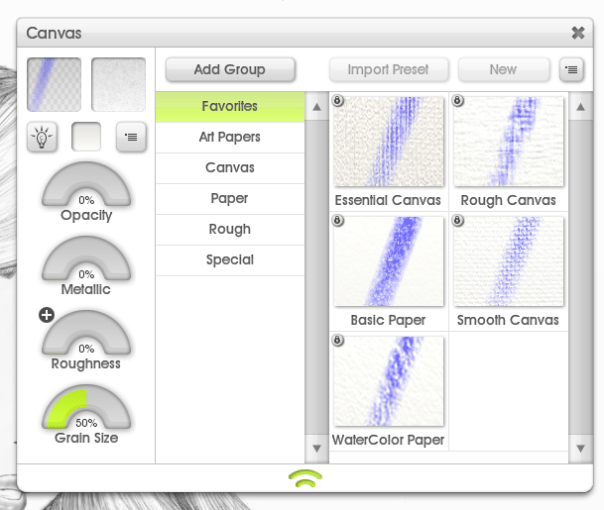 i love the canvas tool for the creation of a full range of paper textures and the ability to apply multiple paper textures to different layers (helpful if you’re going for a mixed media effect). again, you can use the brush controls to determine whether your surface is wet or dry and how media will blend on the page.